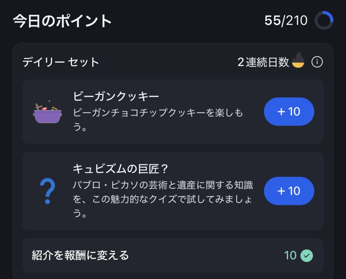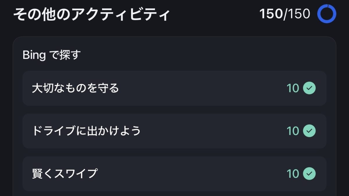 その他のアクティビティは、特定の単語を検索することでポイントが貯まる。これはすぐに貯まったり、該当する単語を検索しても貯まらない場合があるのdで中々曲者。その他のアクティビティは、日によって個数も違う。
