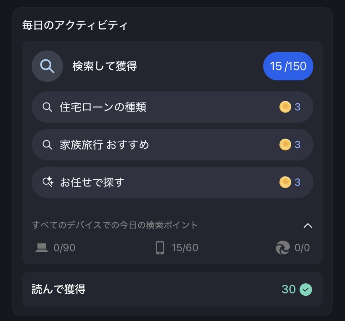 たまに検索してもポイント反映されない場合があるので、「すべてのデバイスでの今日の検索ポイント」が加算されているか確認しておくことをオススメする。