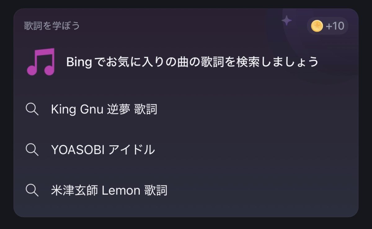 これは、例えば、「Lemon 歌詞」だとダメで、「Lemon lyrics」と入れないと出て来ない。めんどくさいし、それなら初めから例を出さなければ良いのに・・・。こういう項目はたまにあるので、都度調べないといけない。