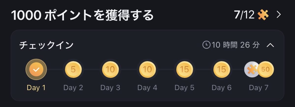 1日1回チェックインで貯まる。7日連続チェックインすると、ボーナスで50ポイント貯まる。プラスで毎日3回検索すると9ポイント追加で貯まるっぽい。