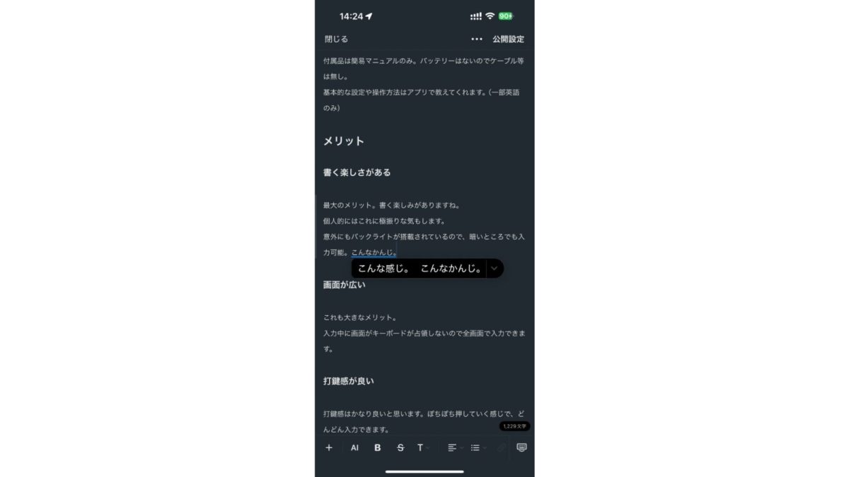 ちなみにフリック入力でもnoteは書けますが、フリック入力はほぼ親指だけで入力をするため、長文は不向きだと思っています。