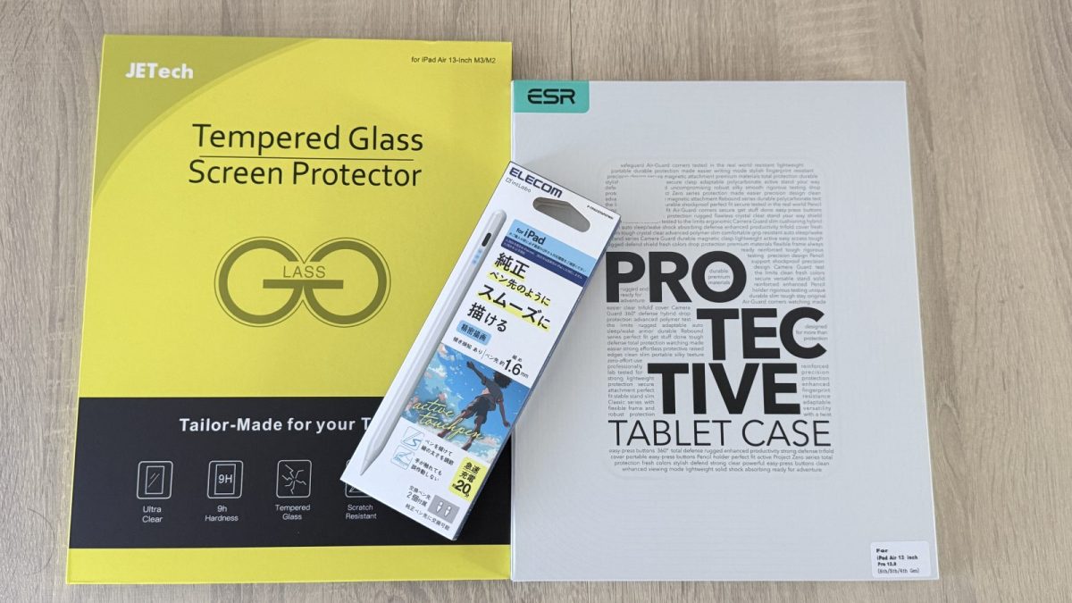 何も考えずにケースとガラスフィルムを購入して使っていますが、ケースはちょっと重たいし、ガラスフィルムはペンシルとの相性が悪い時があるので、地味に周辺機器選びが難しい。