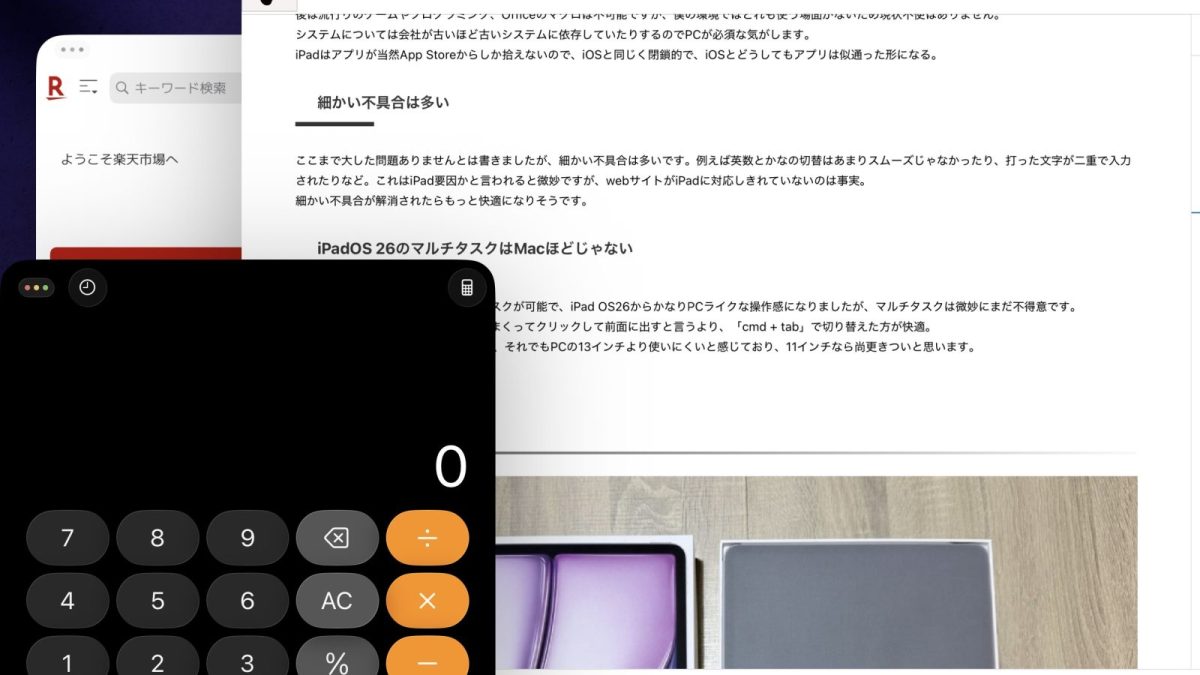 iPadはiPad OSになる前からマルチタスクが可能で、iPad OS26からかなりPCライクな操作感になりましたが、マルチタスクは微妙にまだ不得意です。