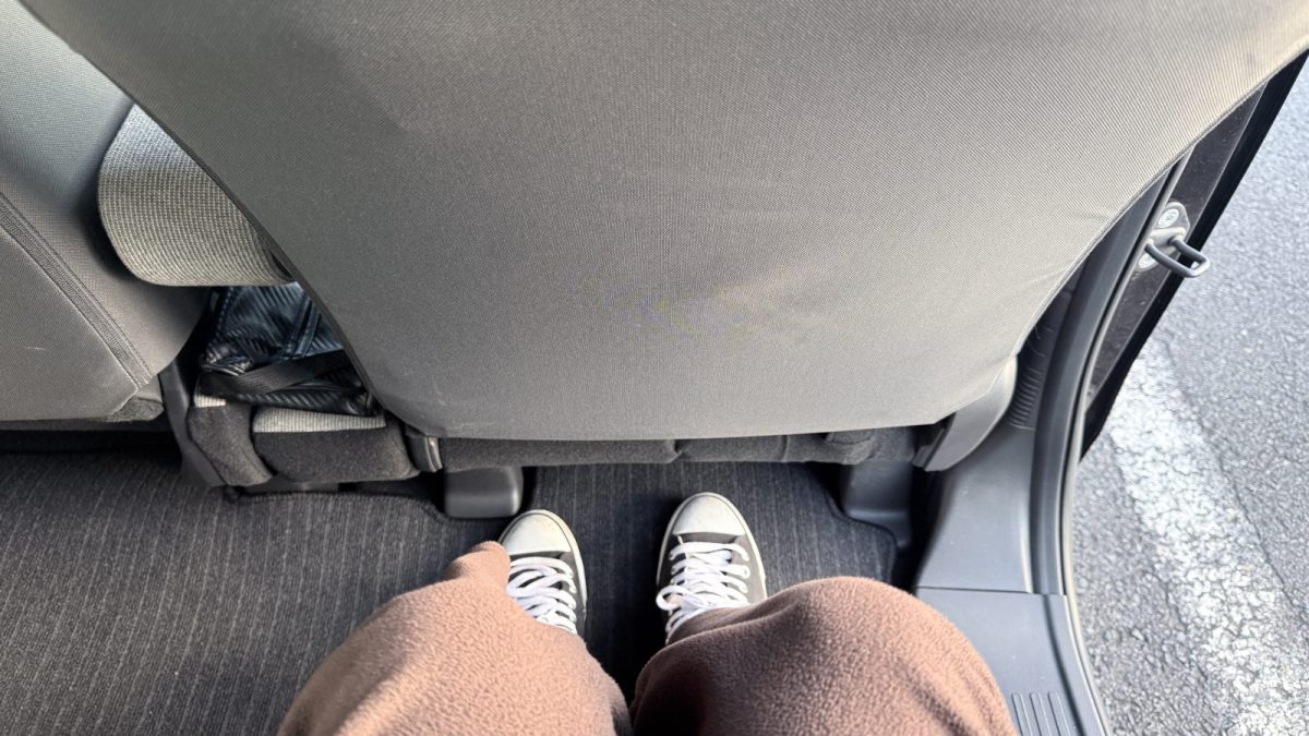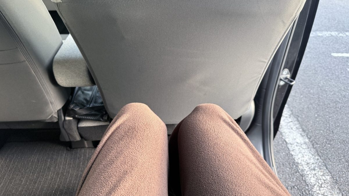 後部座席を少し前まで持って行った状態でも、足元の広さは最低限確保されています。
