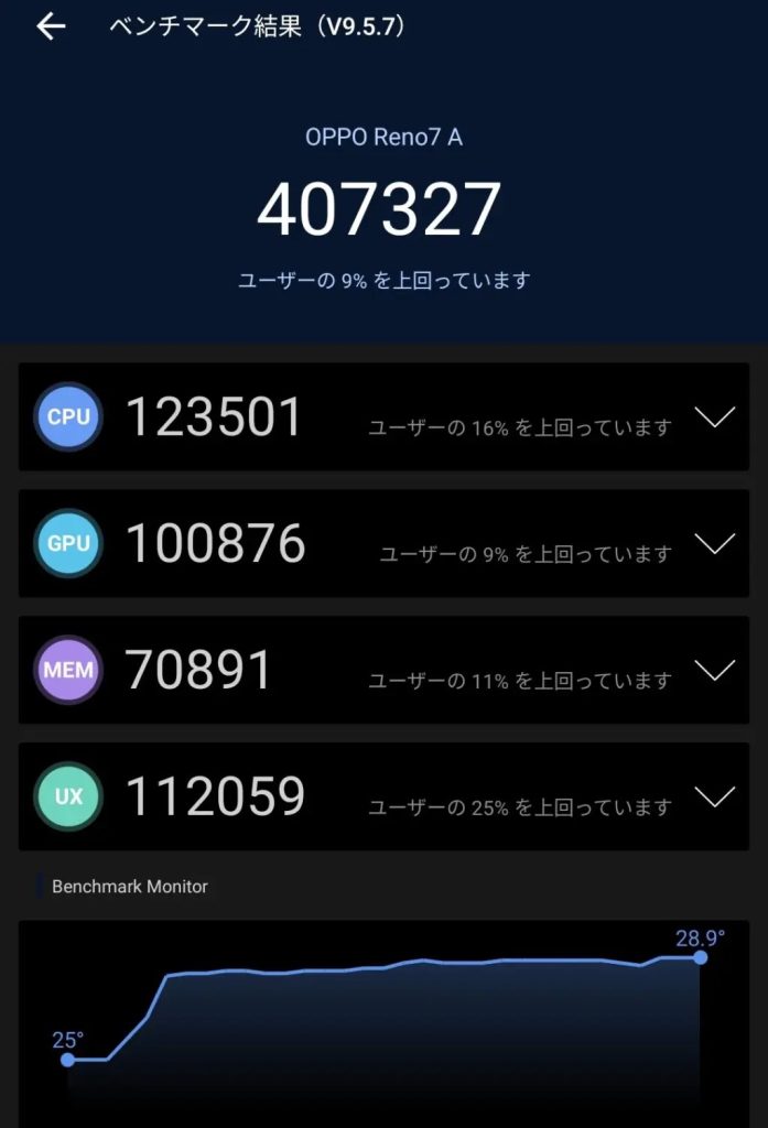 スコアだけ見るとiPhone XS等と同じくらい。温度はあまり上がらなく、熱さを感じなかった。ゲームは重すぎないものなら一応できる。